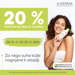 Spoštovane stranke obveščamo, da bo med 15.11 in 23.11.2024 potekalo znižanje izdelkov A-derma. Obiščite naše lekarne in si priskrbite izdelke A-derma po 20% nižji ceni.