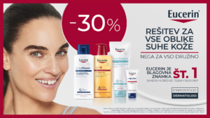 Spoštovane stranke obveščamo, da smo v naših lekarnah pripravili znižanje cen izdelkov Eucerin za nego suhe kože. Obiščite naše lekarne med 7.1. in 20.1.2025 in si priskrbite izdelke Eucerin za nego suhe kože po 30% nižji ceni.