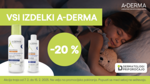 Spoštovane stranke obveščamo, da bo med 05.02 in 15.02.2025 potekalo znižanje izdelkov A-derma. Obiščite naše lekarne in si priskrbite izdelke A-derma po 20% nižji ceni.