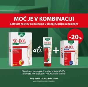 Spoštovane stranke obveščamo, da v naših lekarnah, med 1.3. in 31.3.2025, ob nakupu kateregakoli izdelka iz linije NODOL, prejmejo 20% popust na NODOL Forte tablete.