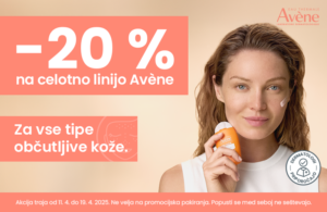 Spoštovane stranke obveščamo, da bo med 11.4. in 19.4.2025 v naših lekarnah potekalo znižanje cen izdelkov Avene. Obiščite naše lekarne in si priskrbite izdelke Avene po 20% nižji ceni.