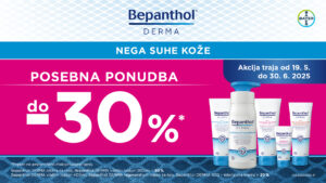 Spoštovane stranke obveščamo, da vam v obdobju med 19.5. in 30.6.2025 ob nakupu izdelkov Bepanthol Derma priznamo do 30% popust.