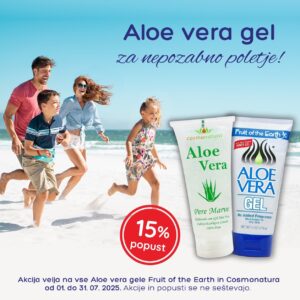 Spoštovane stranke obveščamo, da v mesecu juliju 2025 lahko dobite izdelke Aloe Vera blagovnih znamk Fruit of the earth in Cosmonatura po kar 15% nižji ceni!