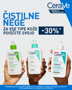 Cenjene stranke obveščamo, da med 1.7. in 21.7.2025 lahko pri nas kupijo izdelke za nego obraza CeraVe Cleaners po 30% nižji ceni.