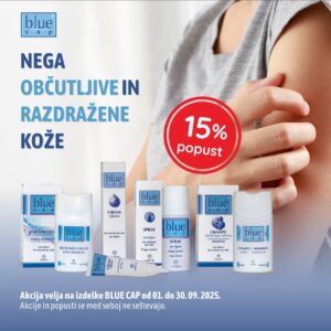 Spoštovane stranke obeščamo,da smo v mesecu septembru 2025 pripravili znižanje cen izdelko Blue Cap. To so inovativni, klinično preverjeni izdelki za nego občutljive kože pri luskavici, atopijskemu in seboroičnem dermatitisu. Obiščite naše lekarne in si priskrbite izdelke Blue Cap po 15% nižji ceni!